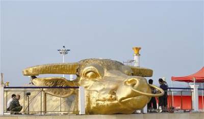 图文:12吨重的铜牛8日,一头身长19米,重达12吨的铜牛横卧在郧西县七夕广场。在铜牛附近,还有织女雕塑与辅助饰品(天河、星座铺装等)与之辉映。据介绍,该铜牛雕塑由著名设计师魏源源创作,有可能是目前世界上最大铜牛雕塑。(本报视界网徐雁初摄)