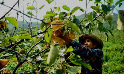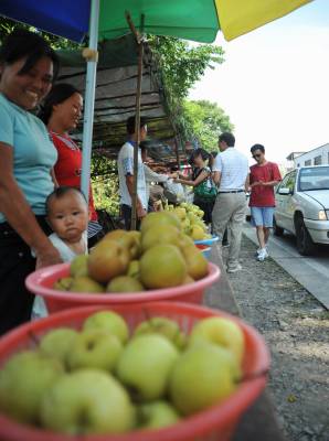 8月9日,经过宣恩县椒园镇的乘客正在路边购买黄金梨。由于气候原因,该县晓关侗族乡的黄金梨还挂在枝头,大概一个星期后才能上市,果农目前正在对枝头的梨子进行最后的打理。宣恩县是盛产黄金梨的大县,今年全县黄金梨面积已达10000多亩,套袋800多万个,预计产值将达800多万元,一个黄金梨的价格平均达到了1元钱。