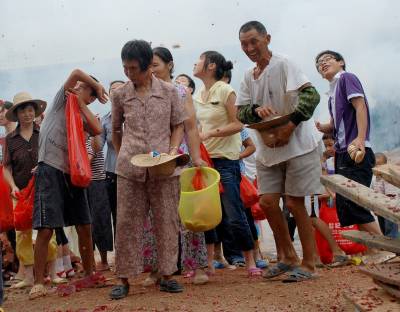 8月7日,笔者在黄梅县苦竹乡柳塘村看到,一村民家做新房举行上梁仪式,按当地的习俗,在隆隆的鞭炮声中,楼顶上的人向下面的人群抛洒喜饼、喜糖,村中的男女老少都来抢捡,以沾喜气。然而,在喜庆的同时,村民们全然不顾身边阵阵的爆炸声,楼顶上的人也没任何保护措施,真为他们的安全捏把汗。刘飞摄
