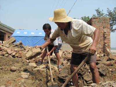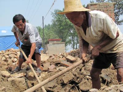 8月8日,郧县谭山镇孝义村村民正清理被淤泥掩盖的砖瓦,准备重建房屋。在”7.24”特大洪灾中,该村215户房屋被淹,900多人受灾。灾后村里到处残垣断壁,伤痕累累。面对灾情,村民不等不靠,奋力自救,齐心协力,重建家园。