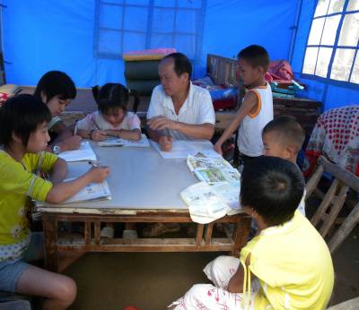 8月7日,湖北郧县谭山镇孝义村的救灾篷里,退休教师高儒红正指导本村的6个留守儿童做暑假作业。7月24日,该村受洪水袭击,学生的教本被洪水卷走,灾后村民们忙于重建,留守儿童的学习更是无暇顾及,高老师从临村借来教本和暑假作业,为村里的孩子当起义务辅导员,专门辅导孩子学习。