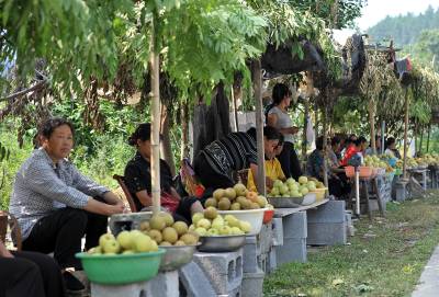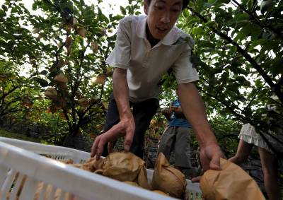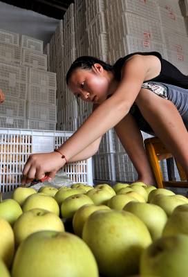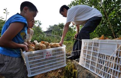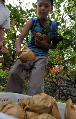 10日,宣恩县椒园镇黄坪村农民姚元祥一家在包装黄金梨。姚元祥说:精选后的黄金梨一盒12个,对上门购买者的批发价为80元/盒,除去几块钱的包装费后折算,一个重4两左右的黄金梨的价格要六块多钱。据了解,2007年该县黄金梨通过有机食品认证,农民严格按照有机食品操作规程进行生产。公司和合作社按照等级进行收购,而一些农民觉得将等外级黄金梨进行零售更划算,于是在国道旁摆起了摊点,每公斤黄金梨的价格也在5-10元左右。本报视界网宋文摄