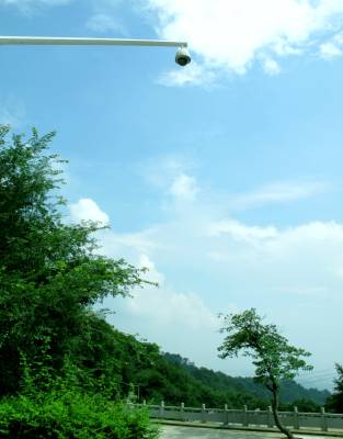 在佛教圣地东方山的台阶入口处,一监控探头高高挂在天上,让人不寒而栗。正所谓:”举头三尺有神明”,所以入寺敬香务必身躬心诚。