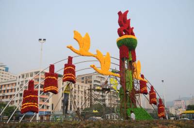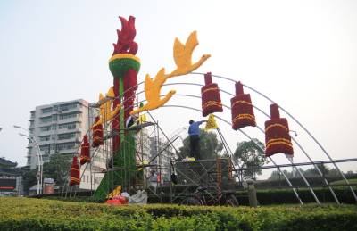 街头扎景迎宾客10日,黄石市杭州东路的明珠广场上,一个近10米高的大型花灯扎景《矿冶新城》正在制作,扎景体现了青铜器、白鹭、西塞山、铜绿山等黄石特色景观。为迎接首届矿冶文化旅游节的到来,该市在城区各主要路口搭建扎景,扮靓城市街头,以迎接四方游客的到来。黄石日报摄影部邱孝威摄