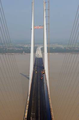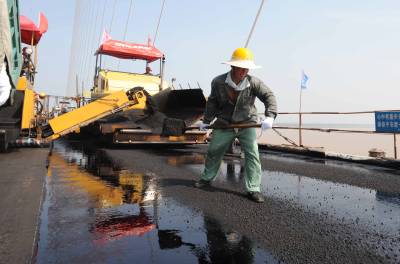 12日,气温高达摄氏38度,荆岳长江大桥的施工人员头顶烈日,脚踏110多度的沥青,冒着高温摊铺桥面,本周内将完成主桥路面的摊铺,11月底该桥将建成通车。这座大桥北岸位于监利县白螺镇,南岸连接湖南省岳阳市,为钢箱梁双塔斜拉桥,主跨长达816米,建设总里程5.419公里,其中大桥总长4302.5米。(记者杨平摄)