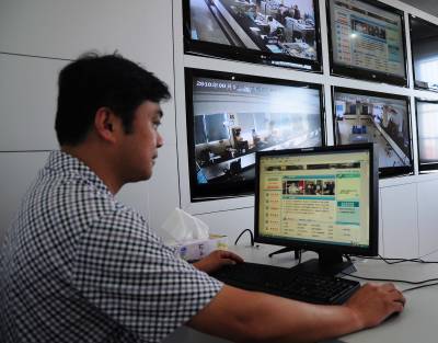 8月12日,黄梅县行政服务中心副主任刘心武在电子监察室对工作人员工作作风、服务态度、在岗情况和办事效率进行实时监控。今年5月,黄梅县行政审批电子监察平台正式开通运行,实时监控县行政服务中心的22个窗口单位、书记县长热线办公室和公安交警、劳动、国税、地税、招投标中心服务大厅以及乡镇便民服务中心、乡镇招投标中心和部分社区(村)便民服务室的办公情况。同时,将行政审批事项、三资管理、行政事业单位国有资产等纳入电子监察范围。(本报视界网王政摄)