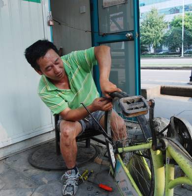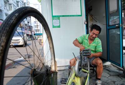 武昌凤凰山自行车出租点的罗师付,工余时间义务修车。8月11日,室外高温虽近40度,他却巳修好了三辆车。每月都有数十台有毛病的自行车经他修复后重新上路!而这一切都是义务的!好一个令人钦佩的修车哥!