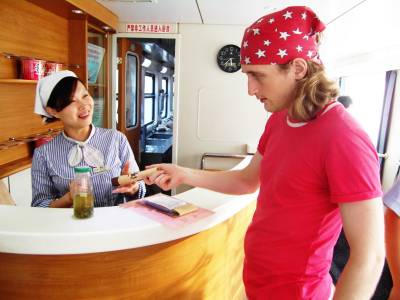 【罗超】8月11日,一个来自俄罗斯自助旅游团体乘坐北京西至十堰”红旗列车”K279次旅客列车,前往湖北武当山旅游。就餐时,他们取出了在中国购买的普洱茶,可又不熟如何泡制。餐车工作人员伸出热情友谊之手,精心泡出了一壶浓郁的中国茶,并亲自沏茶。俄罗斯旅客细细品味,露出笑脸,赞美不已:”ChineseTea——Good!Chinese people——Good!”图为餐车人员刘爱武热情接过俄罗斯旅客递过来的普洱茶叶。