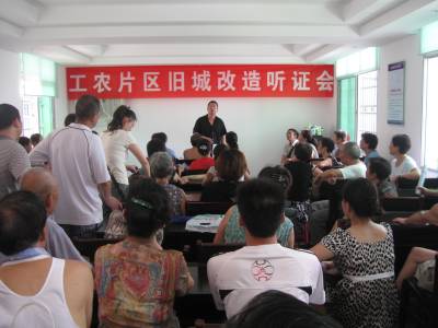 13日上午,荆州市沙市区工农村社区的居民,如约来到居委会,参加由市有关部门组织的关于”工农村旧城改造听证会”。由于涉及到居民的利益,许多没有接到通知的居民也来了,并且发表言辞激烈的演讲。听证会刚开始,市搬迁办的领导才说了几句,有居民提议:”听证会应该有公证部门或者媒体参加,没有第三方是没有说服力的。”现场顿时混乱起来,听证会不欢而散。居民们来到楼下,依然议论纷纷,不肯离去。