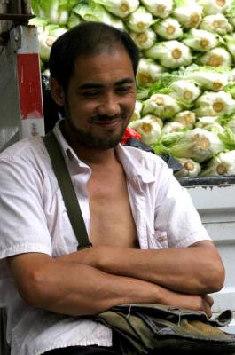 这张照片是2010年8月13日中午,本人在保康县东街十字路口,抓拍的一卖反季节白菜的农民午休,看他笑的多甜蜜。