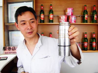 【罗超】”黄老大”,是武汉铁路客运段襄樊北线车间K49/50、K279/280次进京旅客列车餐车领班黄和清师傅。”老大”温文儒雅,却又不失好客热情,给身边的同事和南来北往的旅客留下了美好印象。尤其”老大”使用的杯子别具特色,上面箍有道道橡皮筋,这些都是餐料用后遗弃用品。”老大”用心收集起来,箍在杯子上,不仅可以防滑隔热,最主要能在旅客和同事需要时,随手提供方便。据悉,十几年来,”老大”杯子上共箍过10000多个橡皮筋,为6000余人提供过服务。图为”老大”手持杯子为自己的所作所为颇感欣慰。