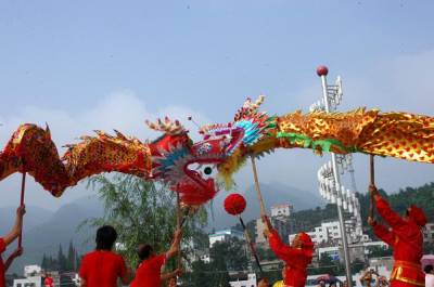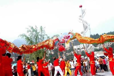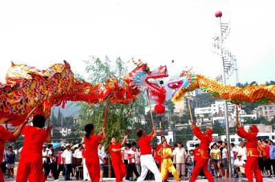 龙是中国神话中的一种善变化、能兴云雨、利万物的神异动物,传说能隐能显,春风时登天,秋风时潜渊。图为2010年8月8日保康县举行全民健身日的舞龙赛。