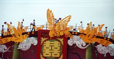 郧西113对新人”鹊桥相会””七月七”,来自美国、非洲等五个国家以及国内8个省份的113对新人在”牛郎织女的相会地”—美丽的天河之畔湖北郧西相聚相会,伴随着1983的精彩演唱,所有的新人登上鹊桥真情相会,让人生的因缘共牵鹊桥。陈鑫金摄影通联:郧西县交通运输局电话:0719——6227383