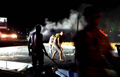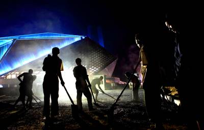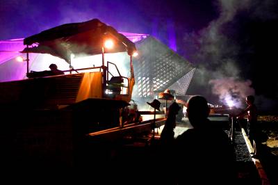 《挑灯夜战》8月15日黄石新体育馆施工单位,在晚上凉爽时段组织工人挑灯夜战,实施体育馆西门最后一条通道的收尾工程。