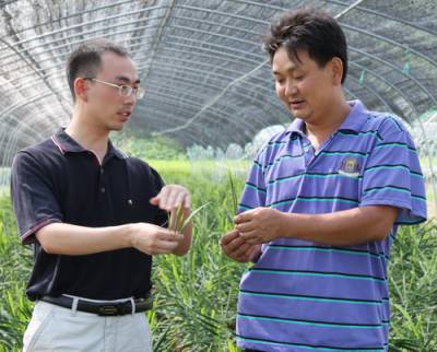 湖北省竹溪县县河镇狠抓”菜篮子”工程,引进新品种,科学种植,精心管理,以满足广大消费者的需求。8月16日,该镇党委书记、镇长洪涛(左)在蔬菜大棚查看引进的生姜新品种防治病虫害情况。地址:湖北省竹溪县电视台沈耀武刘敬海摄邮编:442300电话:0719-2726051