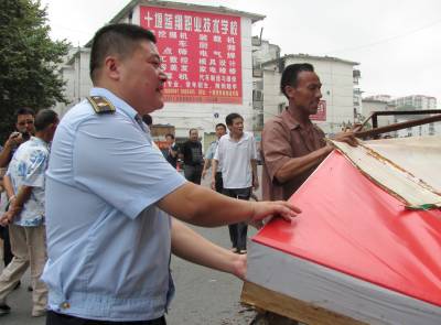 8月17日,十堰市城建监察大队干部正帮店主拆除一不规范招牌。为规范城区户外招牌设置,美化城市容貌,提高城市品位,连日来,市城建监察大队对城区临街门面存在空置、陈旧、变形、污损、字体残缺、灯光不全等影响市容市貌的两百余家店名招牌进行整治。