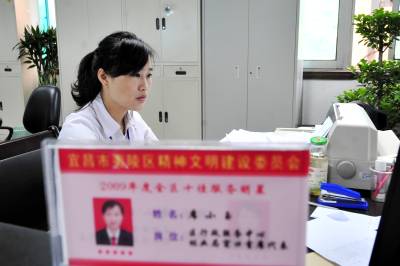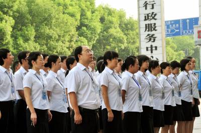 2010年8月17日,湖北省宜昌市夷陵区行政服务中心工作人员统一着装上岗,实行亮牌服务。今年,该中心围绕”效率和服务”主题,提升服务水平,营造一流的环境,提供一流的服务,着力打造”便民直通车”服务品牌。中心工作人员秉承”宁可自己麻烦百次、不让群众为难一次”的服务理念,采取审批提速、简化流程、创新审批等措施,为办事群众提供了快捷便利的服务。本报视界网张国荣摄