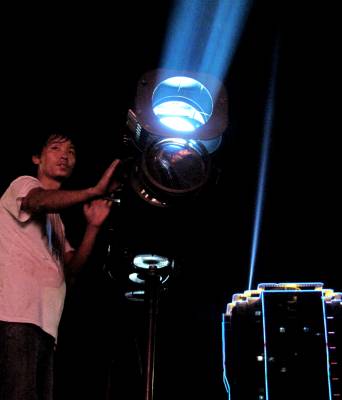 在黄石市职工文化艺术节文艺演出晚会上,一名打追光灯的人,抱着高温的追灯,不停地寻找台上的主角,热得满头大汗,观众戏称他为追”星”族。