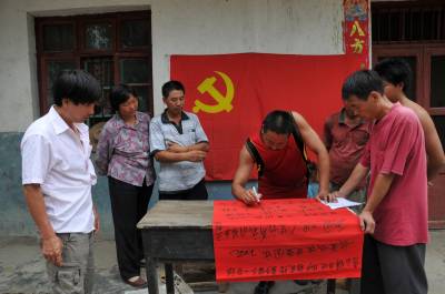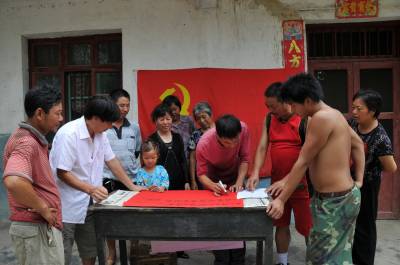 8月18日,南水北调中线工程核心水源区湖北省郧县青山镇琵琶滩村177名移民经过长途旅行顺利进住潜江市2个安置点上,临走他们用黑笔红纸为家乡留下一句话,”我爱我家,更爱国家”。”为家乡增光添彩”。”舍小家,为国家”。等字句,表现了外迁移民们的爱国情怀,并签下了每个人的名字。图为外迁移民村主任王万里正在红纸上写下一句话时的情景。周家山杨文华摄湖北省郧县城建监察大队电话13872840078邮编442500