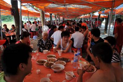 8月19日下午2时,南水北调中线工程核心水源区的湖北省郧县城关镇堰河村,金岗村和马场关村135户547名外迁移民乘座15辆客车经过8个多小时旅途顺利到达武汉市蔡甸区洪北管委会西干村安置点。武汉市蔡甸区在西干村安置点举行了隆重的欢迎仪式,在校园内操场上搭起了6个灶台,10余名大师傅们正在忙着油炸清蒸,50张桌子分南北向分3排摆放在操场上,每张饭桌上都支赶了一个凉棚,安放了一个落地电风扇,吃完中午饭后晚上蔡甸区四大家领导为欢迎郧县移民乔迁之喜举行盛大晚筵。图1为移民正在学校操场上吃午饭时的情景。图2为武汉市蔡甸区洪北管委会西干村移民新村。图3为两地书记,市县长正在试用发给移民手机时的情景周家山杨文华摄湖北省郧县城建监察大队电话13872840078邮编442500