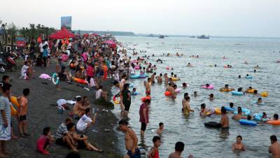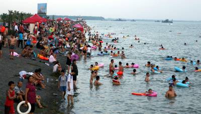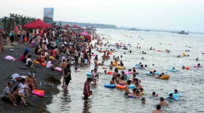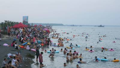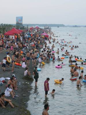 8月19日傍晚,在汉江襄樊段鱼梁洲附近的江堤上和浅水区人满为患。入秋以来,湖北省襄樊市持续出现35℃以上的闷热天气。连日来,在汉江襄樊段鱼梁洲附近几公里的浅水区,每到傍晚数千市民前来天然浴场戏水,享受清凉,躲避酷暑。
