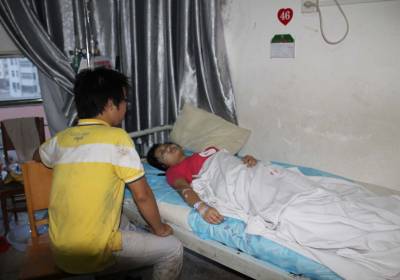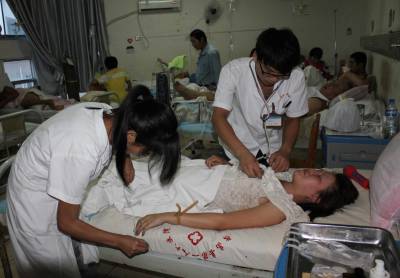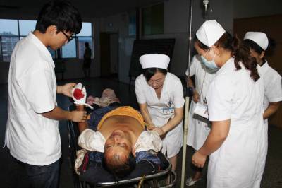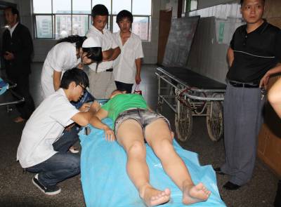 8月22日下午4点30分许,孝感市双峰山风景区双乳峰滑道因下雨发生意外叠压,5人从同一条1滑道滑下,4人因叠压不同程度受伤。18点50分许,笔者来到孝昌县人民医院住院部,见3名受伤的女学生都已经拍完片送到了这里。医生正在询问一名穿绿上衣女学生的伤情。另一名穿红上衣和一名穿白上衣的女学生已经送到了病房观察。一名穿黄上衣的男生告诉笔者,他和受伤的3名女生都是华中农业大学的学生,今天上午一起到双峰山景区游玩。下午4点30分左右,天下起了雨,滑梯承包男子带他和3名女生从双乳峰100米滑道往下滑,不料发生了叠压,好在自己在最后没有受伤。19时许,一名受伤的男子被送到了住院部4楼。据医生初步检查,该名男子的左手受伤,左腿骨折。该名男子的妻子徐女士告诉笔者,他丈夫叫刘荣现,41岁,是河南省平顶山市陆山县人,也是双峰山景区双乳峰滑道的承包人.徐女士说,下午4点30分许,天下起了雨,其丈夫刘荣现在双乳峰滑道上,带3女1男4名学生从上往下滑,刘荣现在前面,3名女生在中间,男生在最后。由于下雨滑道比平常滑溜,5人快速从上冲下,几名女生叠压在刘荣现身上,造成前面4人不同程度受伤。宋俊初摄