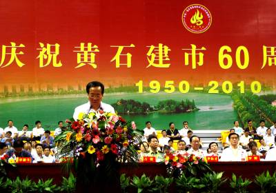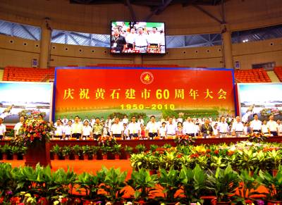 8月21日,黄石隆重庆祝建市60周年,湖北省副省长任世茂、周坚卫等贵宾出席,大会表彰了”十大功勋人物”和”六十位突出贡献人物”。会议由黄石市市长杨晓波主持,市委书记王建鸣发表致辞讲话。