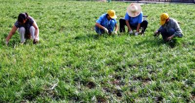 湖北省郧县近几年来不断加大城市绿化,美化,香化,净化建设,植树造林30万株,栽植绿地20万平方米,人均实现绿地10平方米。图为近日园林工们正在清除绿地中的杂草时的情景。周家山杨泽华摄湖北省郧县城建监察大队电话13872840078邮编442500