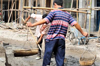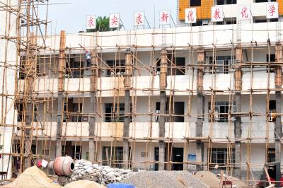 连日来,在今夏遭受暴雨泥砂袭击的湖北省宜昌市夷陵区乐天溪镇三峡小学维修施工现场,工人战高温、加班加点,清运淤泥,对受损的校舍进行加固、粉刷,确保今年秋季学期如期开学。本报视界网张国荣摄
