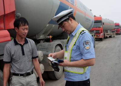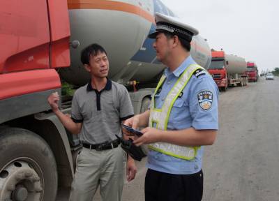 严查危化运输车辆8月24日,荆门市交警支队民警,在城郊拦卡设点,检查危化品运输车辆司机的危险品运输从业资格证、押运人员押运证等。该市危化品企业众多,市交警支队对这些气罐、油罐车辆实行严查严管,防患未然,确保安全。本报视界网陈旭摄