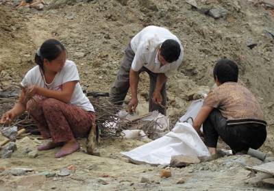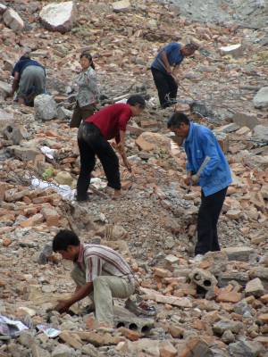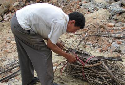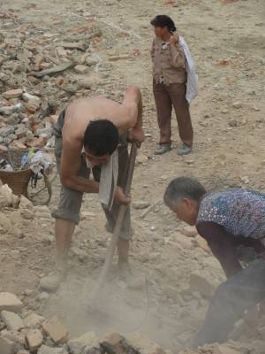 2010年8月20日,一批”拾荒大军”拿着铁锤、钢钎等工具,在十堰市一建筑工地”淘金”。该市在近几年大拆迁过程中工地上遗留的废钢筋、废铁丝吸引了大批拾荒者前来捡拾。这些拾荒者最多一天可以捡拾到一百多斤废铁,能卖两百多元,如此”淘金”既可让废物实现再利用,又可让”淘金者”增加收入,改善生活。