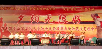 8月24日晚,秋高气爽,荷花飘香,《洪湖赤卫队》拍摄基地再次响起《洪湖赤卫队曲联奏》。由洪湖市人社局、文化局联合举办的企业退休人员”夕阳无限好”文艺晚会在该市荷花广场隆重举行。全市13个社区选送的20个节目文艺节目表达了全市36000多名离退休人员”老有所养老、老有所乐”的幸福晚年。湖北省养老保险局 侯绍军