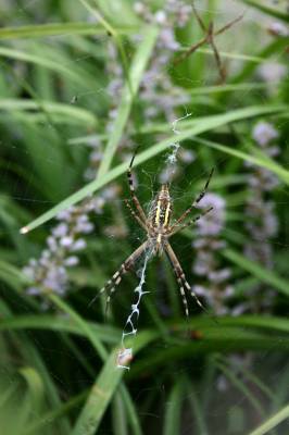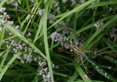 在京山县新市镇中一花坛中,笔者发现了一只奇异的蜘蛛,安静地在花丛中守株待兔,它结的网与后面一只普通蜘蛛结的网截然不同,仔细辨认,好似黑体英文字母XYZ。真是有意思极了。这只蜘蛛的体长大约2厘米,8只脚两两相并呈X形分布,头胸部较为扁平。一般蜘蛛的头胸部和腹部之间有一腹柄,但是这只蜘蛛没有腹柄,其腹部五彩斑斓,夹有红、黄、白等多种色彩的条纹,就像蜜蜂一样。当用硬物触动它时,它便用力使整个蜘蛛网剧烈晃动,并在四串字母间走动,非常敏锐。据一位林业技术人员介绍,这种神奇蜘蛛在分类学上属于蛛形目金蛛科金蛛属的动物一般织网于户外的小树等绿色植物上。这种蜘蛛有编织”文字”习性,目的可能是想利用这些神奇的”文字”反射出耀眼的太阳光,阻吓来犯的天敌,属于自我保护的一种无意识行为。张文胜摄