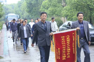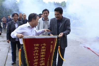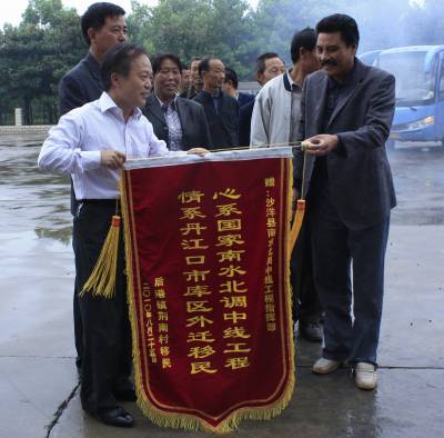 沙洋丹江口移民锦旗表谢意8月26日,沙洋县后港镇荆南移民新村的13名代表将一面锦旗送到该县南水北调中线工程指挥部。南水北调中线工程移民安置工作启动以来,沙洋县共接收丹江口市牛河林区移民340户1508人,向移民提供成片优质土地2665亩,提供10种房屋户型,并帮助移民解决生产、生活、就业等方面的困难,确保他们”安得下、稳得住、能发展”。