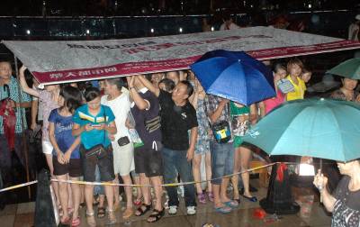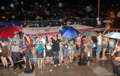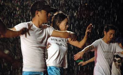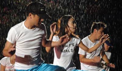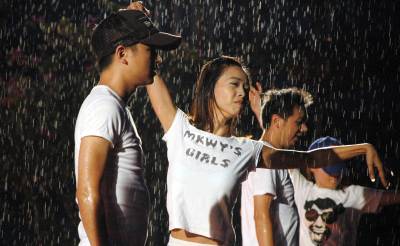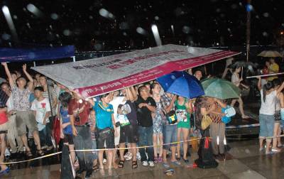 8月22日晚,恩施市举办2010恩施土家女儿会相亲大派对,一群舞蹈演员在雨中翩翩起舞,而台下没带雨伞的观众聚在一起,用手举起一块广告牌,以便避雨观看节目。