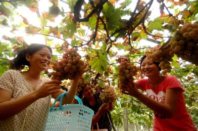 喜摘葡萄26日,几名游客在通山县九宫山镇生态农业观光园内喜摘葡萄。该观光园总面积400亩,是当地精心打造的全省农业旅游观光示范点。近年来,该园引进美人指、红地球、粉红亚都蜜、维多利亚、无核白鸡心、黑玫瑰、巨玫瑰、藤稔等30余个世界名优葡萄品种进行种植,不断提高产品品质,缩短了生长周期,年可收获葡萄50万公斤,接待游客近20万人次,创产值300万元。袁灿摄