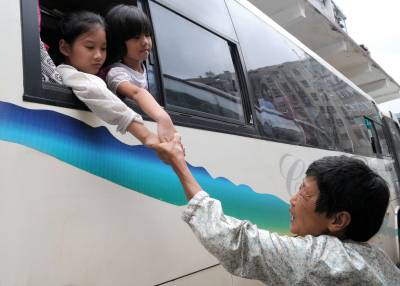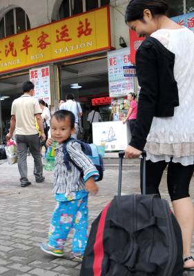 ”小候鸟”暑期东南飞(图一)26日,王德珍老人在黄石长途客运站客车上紧紧拉住孙女段赟、外孙女王睿手依依不舍。今年读初一的段赟父母在阳新县工作,王睿的父母在阳新县打工。暑假期间,她们俩结伴一起回英山老家,与爷爷、奶奶度过了假期。现在快开学了,王德珍老人从英山县亲自把姐妹俩送到黄石,再让她们自己坐车回阳新。老人说,因为家里忙,她实在没有时间送姐妹俩回阳新,她已与在阳新的媳妇联系好,让她在阳新车站接车。(图二)3岁的杨涛在母亲的带来下,高兴地从黄石长途客运站乘车去咸宁与父亲团聚。他的父亲是安徽人,在我省咸宁打工。上幼儿园的他暑期回老家看望爷爷、奶奶,现在幼儿园要开学了,他又随妈妈回咸宁。黄石市黄石日报摄影部邱孝威摄电话:13807232603邮编:435002