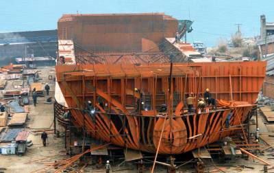 2008年2月23日,工人正在湖北省宜昌市夷陵区乐天溪镇船厂建造大型滚装船。近年来,三峡工程移民大镇——宜昌市夷陵区乐天溪镇投资2000余万元,建成了占地140亩的”沿江船舶工业园”,形成了25万吨泊位的船舶生产能力,年产值达两亿元,接收540多名三峡移民到厂里就业。视界网签约摄影师张国荣摄