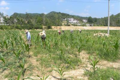 罗田县加强灾后复种农作物的管理工作,普遍实行一次除草、一次追肥、一次间苗的管理。图为白莲河乡李家塆村村民在给复种玉米的除草。记者曲河本报视界网张金龙闻静摄
