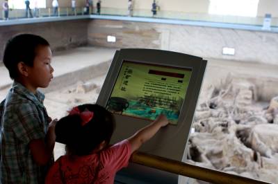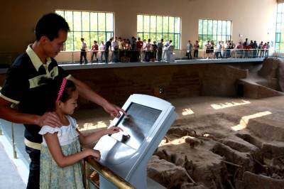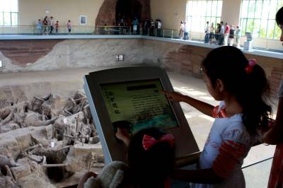 遗址重新开放,日参观量超历史总和昨日,一名家长利用周末的时间带着孩子参观铜绿山古铜矿遗址时,在电子显示屏上了解遗址的相关知识。1984年12月建成开放的古铜矿遗址,三年前因地址沉降,造成遗址开裂而闭馆。经过整治后,重新焕发矿冶光彩的遗址,在本月21日的中国-黄石矿冶文化节期间重新开放。据该馆工作人员介绍,目前遗址的日参观人数每天高达3万人次,仅一天的日参观客流量,就已突破建馆以来的历史总和。视界网郭小勇摄单位:湖北黄石新下陆区大冶有色宣传部核稿:159715443730714-3100121