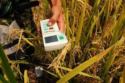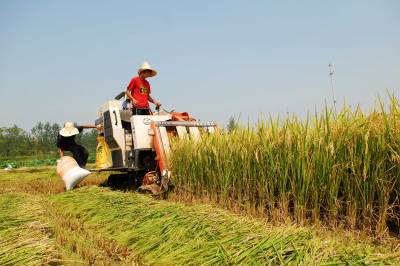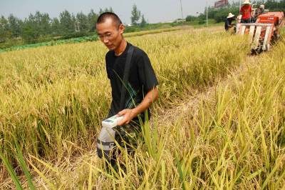 2010年8月29日,湖北云梦,江苏连云港人相海涛带领的收割机团队在稻谷地中作业。只需运用装备有GPS的面积测量仪围绕稻谷地走一圈,就可以知道收割的稻谷地有多少亩;机器收割一亩地,只需几分钟就可以完成,而且归仓率非常高。高科技助夏粮归仓,让农民获得了高回报。