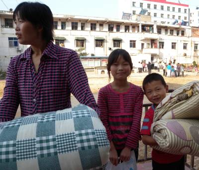 8月30日,湖北省郧县谭山镇中小学迎来了新学期的第一天。随着农村学校布局规划的调整、教学点的撤并,谭山镇完全小学自2008年秋季开始全面步入了寄宿制小学建设的旅程。农村寄宿制学校的建立,为整合教育资源,改善办学条件创造了良好的契机,为培养小学生独立生活的能力提供了广阔的空间。图为小学三年的学生张丽丽在妈妈和弟弟的陪同下到学校报名,开始进入崭新的寄宿生活。