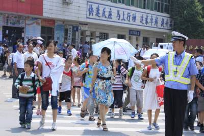 开学第一天,交警护学忙8月31日,在沙洋师专附属小学门口,沙洋县交警大队民警正在执勤指挥,确保前往学校报到的学生和家长安全过马路。为了确保学生的交通安全,沙洋县交警大队派出民警深入学校,通过给学生上安全课、放教育片、发放资料等形式,开展交通安全宣传教育活动。同时,开展交通护学活动,在全县中小学校周围共设立警示标志18块,减速板26处,勘划人行过道2600平方米,有效净化了学校周边环境。