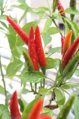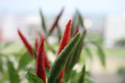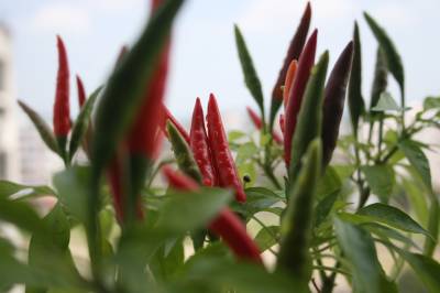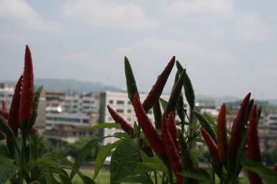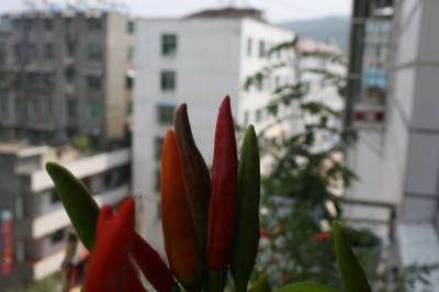 9月1日摄于竹溪县城关镇红光小区,阳台花卉秋景。该县城区有80%居民利用阳台或在窗台安装花架,盆栽花卉或茄子、辣椒等,既可培育成阳台风景观赏,又可成当蔬菜吃,一举两得。