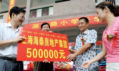 献出一份爱心托起一份希望9月1日,上海海泰房地产集团为刚刚搬迁到新校园的黄石市湖滨路小学捐赠50万元助学款。湖滨路小学地处东风路旧城改造,老校区成旧破烂。借助东风路旧城改造的机会,湖滨路小学建起了新校区,学生们开学便在焕然一新的校园上课学习。黄石市黄石日报摄影部邱孝威摄