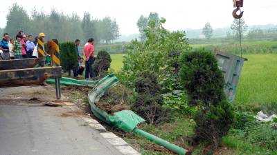 > 大货车撞坏防护栏翻入稻田