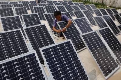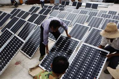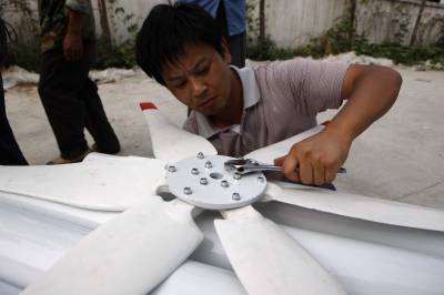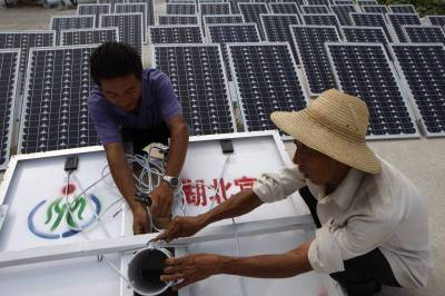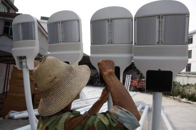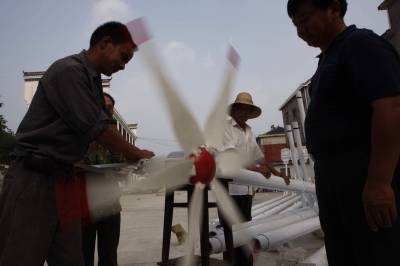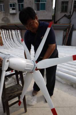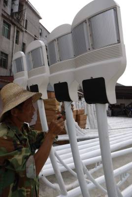 宜昌农村推广普及环保太阳能路灯2010年9月3日,工人在湖北省宜都市潘家湾土家族乡安装调试太阳能电池板。湖北宜昌农村大量推广普及的LED路灯,是采用风能和太阳能发电产生的电源,供路灯夜间照明,不需交流电源,不需电费并具有绿色、环保、节能、低炭的特点。该产品是我国重点推广的节能环保、绿色照明的高科技成果。文振效2010年9月3日,工人在安装调试太阳能风力发电机。