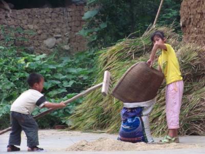 小移民帮忙抢收稻谷