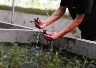 小龙虾:禁捕令VS人工繁育昨日,湖北省潜江市莱克水产食品股份有限公司技术员在给龙虾喂食。该公司是全国首家小龙虾工厂化繁育基地,也是全国最大的小龙虾批量繁殖基地。他们采用”控制光照、控制温度、控制水位、改善水质、加强投喂”的”五位一体”的人工诱导繁殖技术,促使小龙虾性腺发育,同步产卵,避免了近亲繁殖导致的个体小、抗病能力差、出肉率低等问题,实现优生优育。繁育基地种虾抱卵率普遍已达70%以上,最高达90%,幼虾可以实现批量脱离母体,年产虾苗1亿尾以上。专家发现小龙虾苗种存在退化现象,抗病性降低。为了保护虾种,我省规定,从今年起,每年9月1日至12月31日为小龙虾禁捕期,禁止在省内长江、汉江和湖泊、水库等天然水域捕捞小龙虾。本报视界网吴燕军摄