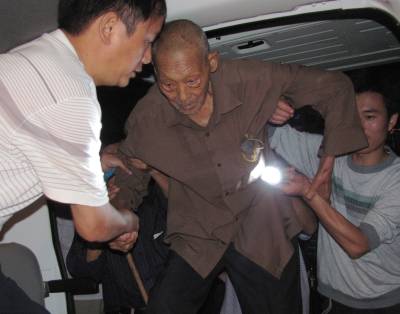9月5日早上,郧县杨溪铺镇卫生院医生正在为年老体弱的移民龚万寿体检,及时了解身体状况。杨溪铺镇为南水北调中线工程核心水源区,当天龚万寿随该镇杨溪铺村5个组147户657人外迁宜城市邓林农场,因年老体弱,行动不便,临时从客车上转移到随从应急救护车上,由医生、护士陪护,以确保顺利外迁。(湖北郧县新闻中心曹忠宏摄电话:13294212877)
